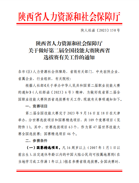 关于举办第二届全国技能大赛陕西省选拔赛报名的通知
